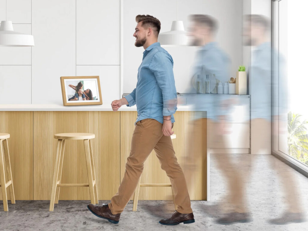 Our eco-friendly power-saving design automatically turns off the device when you exit the room, and it eagerly awaits your return, displaying new moments as you approach.
